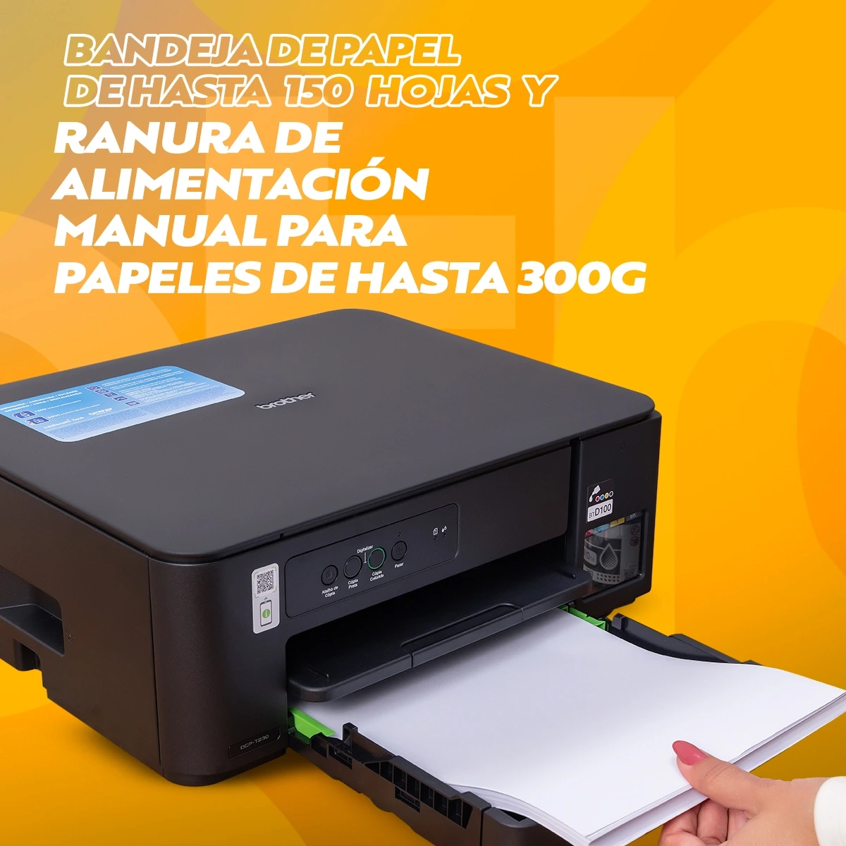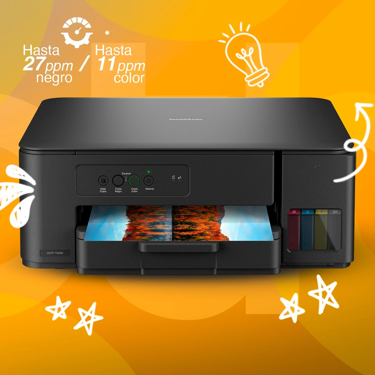 La impresora 3 en 1 de inyección de tinta a color DCP-T230 de la serie InkBenefit Tank de Brother hace que imprimir en el hogar sea fácil y simple. Velocidades de impresión de hasta 27 páginas por minuto en negro y 11 páginas por minuto en color cuando imprimes en modo Eco, y velocidades de 16 ipm en negro y 9 ipm en color (ISO/IEC 24734)‡. El panel de control es fácil de usar y te permite acceder a las funciones de la impresora rápidamente. Maximiza tu productividad con la bandeja de papel de 150 hojas y la ranura de alimentación manual de una hoja‡ que te permite manejar una variedad de tamaños de papel, incluidos sobres y fotografías. Conecta la DCP-T230 a tu computadora mediante el cable USB 2.0 incluido y disfruta de una fácil interconexión entre los dispositivos y la impresora. La InkBenefit Tank DCP-T230 de Brother ahora cuenta con botellas de tinta rediseñadas con una boquilla antiderrames para llenar el tanque fácilmente y en segundos, ayudándote además a que insertes las botellas correctas para cada color. Esta impresora viene con botellas de tinta de ultra alto rendimiento de aproximadamente 7.500 páginas en negro y hasta 5.000 páginas en color.