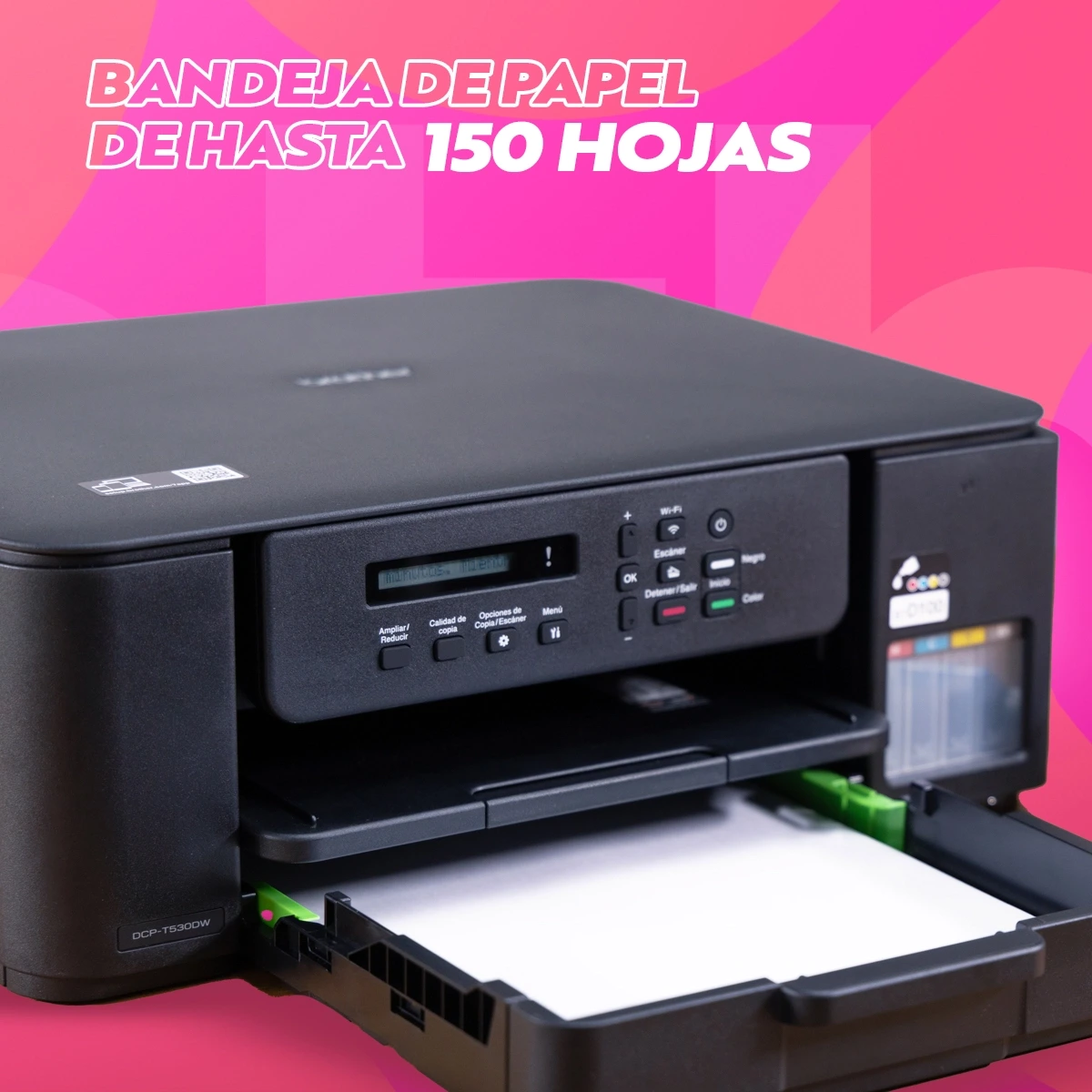 Bandeja de papel de hasta 150 hojas, con el rediseño de la bandeja de papel ahora es más sencillo colocar las hojas, solo necesitas ajustar la bandeja según el tamaño de papel (carta u oficio).