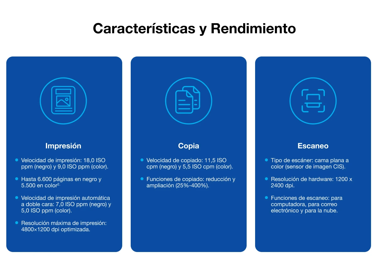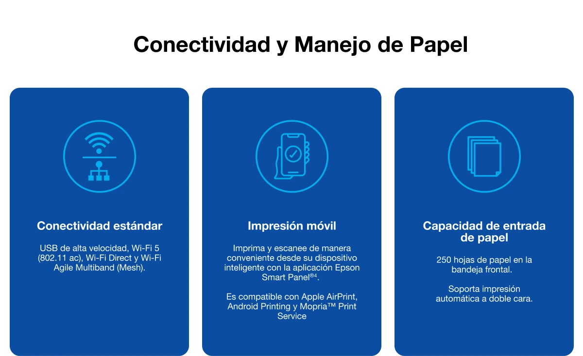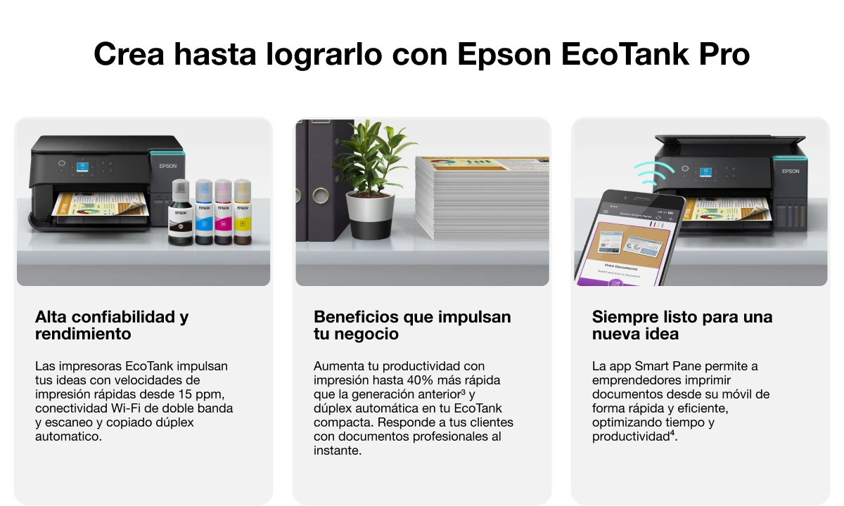 La Epson EcoTank L6370 es ideal para emprendedores y pequeñas oficinas que buscan alta productividad y bajo costo. Imprime, copia y escanea con Wi-Fi dual band y Ethernet, dúplex automático, pantalla LCD de 2,4" y gestión móvil mediante la app Epson Smart Panel. Ofrece rendimiento de hasta 8.500 páginas, incluye tinta para 6.600 en negro y 5.500 a color, y utiliza tecnología PrecisionCore Heat-Free para mayor eficiencia y ahorro de energía. Compacta, confiable y con garantía extendida, está diseñada para impulsar tu negocio sin cartuchos y sin preocupaciones.